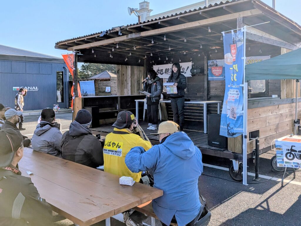 スタートイベントにはオートバイ女子部 坂元誉梨さん!歌うバイク女子 花野ちゃん!がゲストMCで登場!参加者との掛け合いによるトークショーで盛り上がりました!