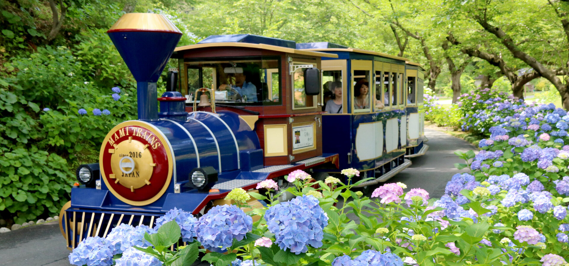 園内を走るフラワートレインと花々のショットは、メルヘンな世界観を演出してくれます。夜間開園時のライトアップも魅力。