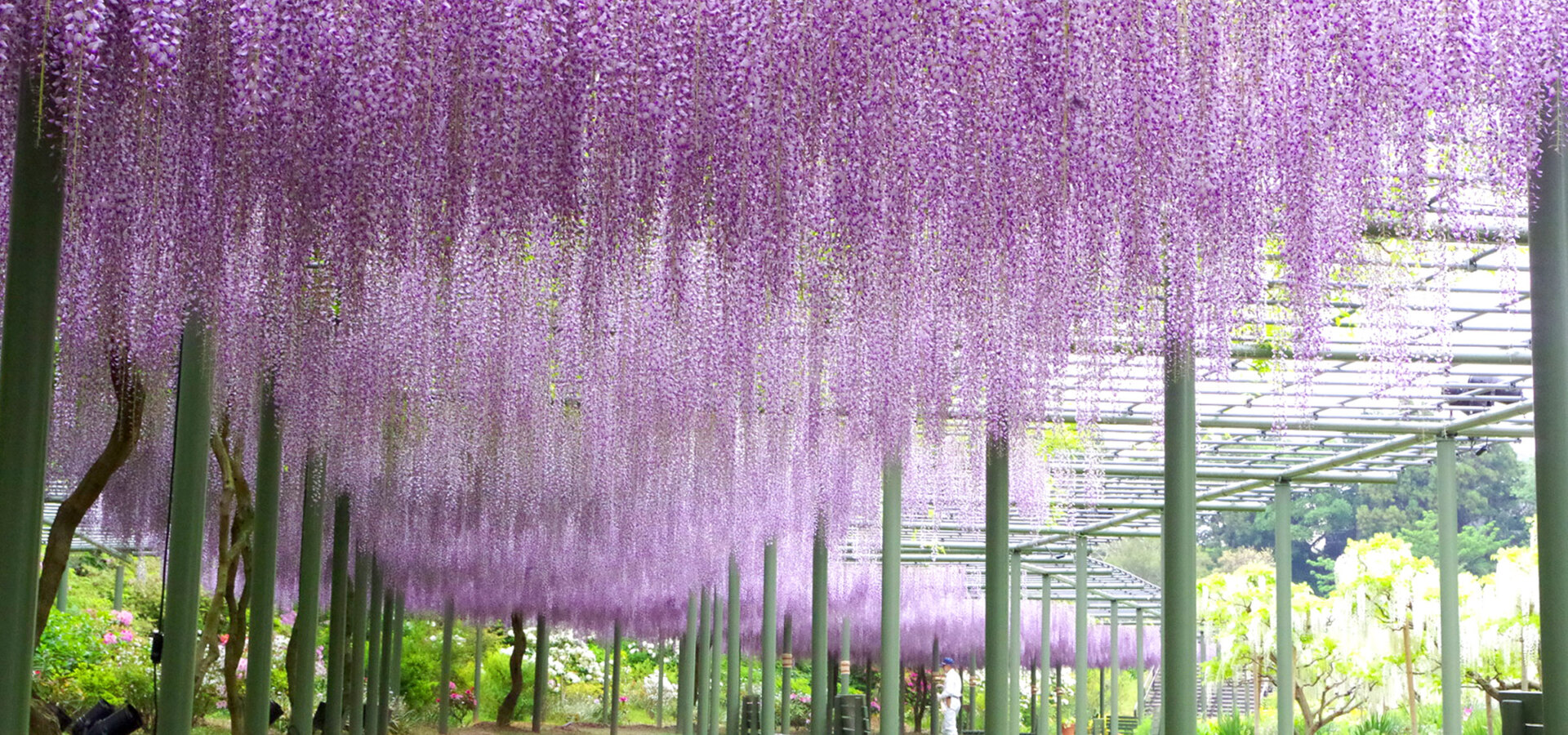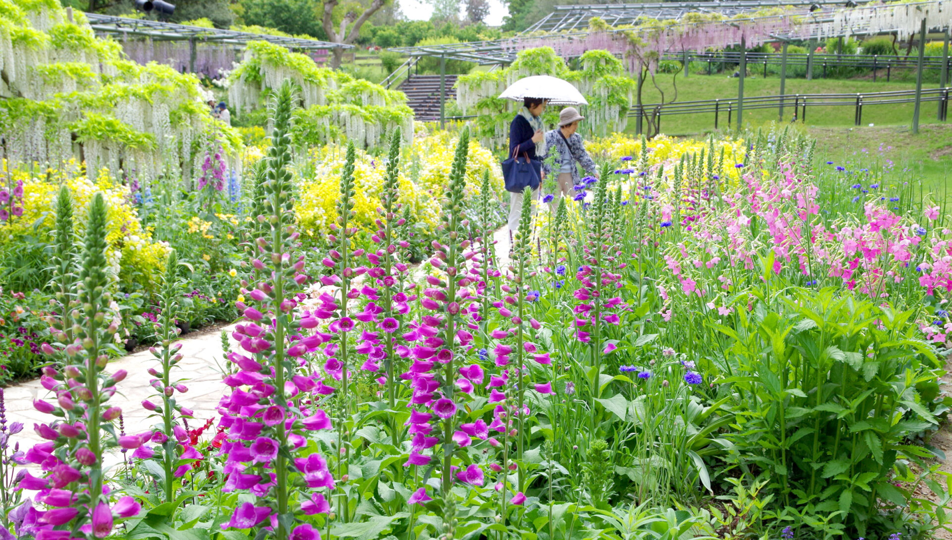4月中旬からネモフィラ、4月下旬には藤、5月にはバラ、6月には紫陽花等が楽しめ期間中にさまざまなお花を楽しめる。