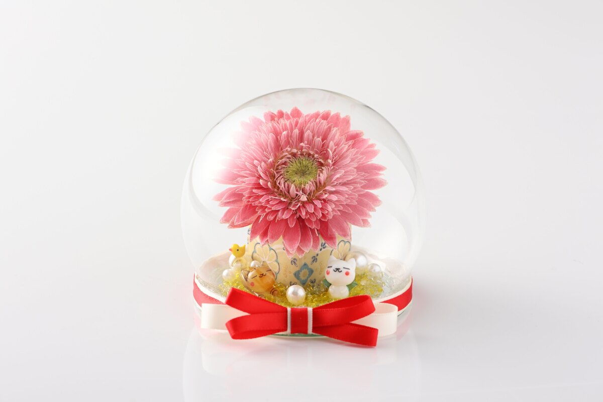 ガラスのドームの中に本物のガーベラをあしらったアレンジサンドドーム®です。