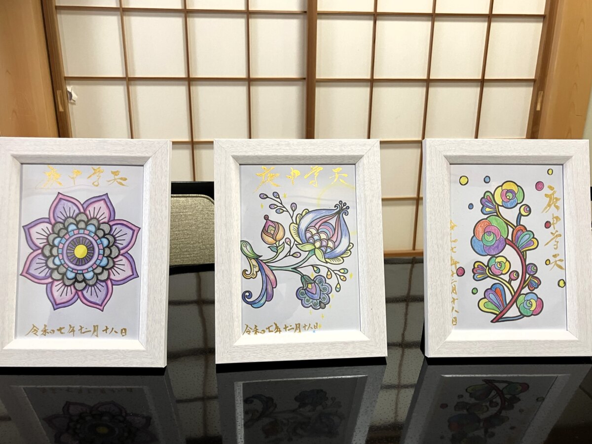 →ぬり絵に言葉を書き入れ、自分だけの御朱印が完成し、額に入れてお持ち帰りいただけます。