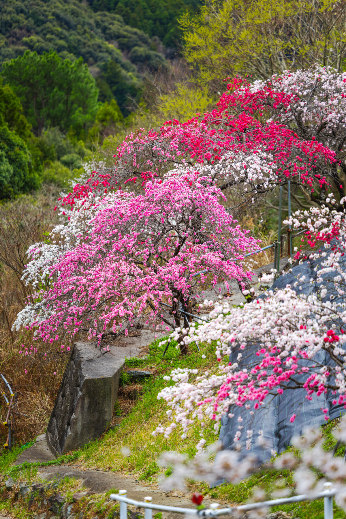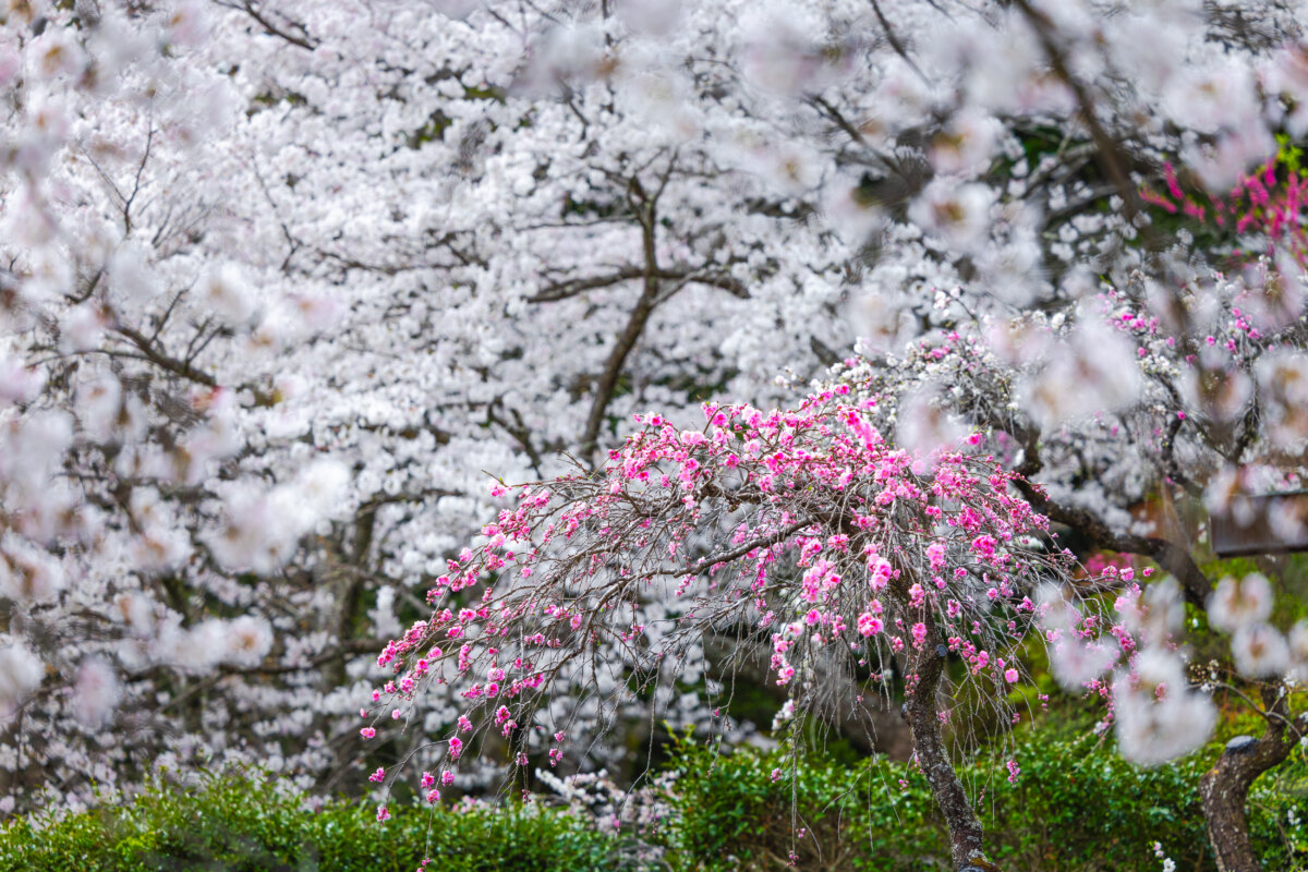 1本の木に3色の花を咲かせる源平しだれ桃や山桜、しだれ桜といった春の花々が境内を美しく彩ります🌸