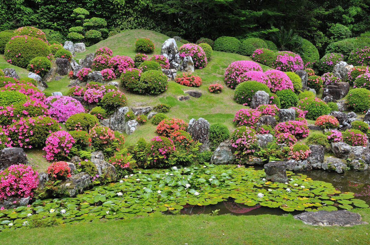 春のさつき、秋の満天星(どうだん)と四季折々の変化にも富み、昭和11年国指定名勝になりました。