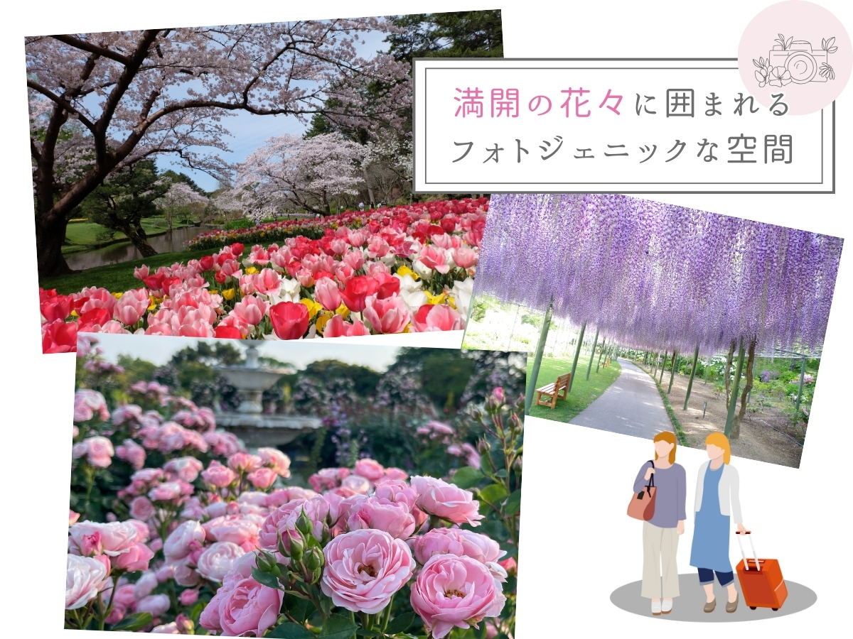 花をテーマにしたフォトスポットや癒しの温泉、彩り豊かなビュッフェ、限定ランチ、スイーツなど、女子旅にうれしい要素が詰まっています。