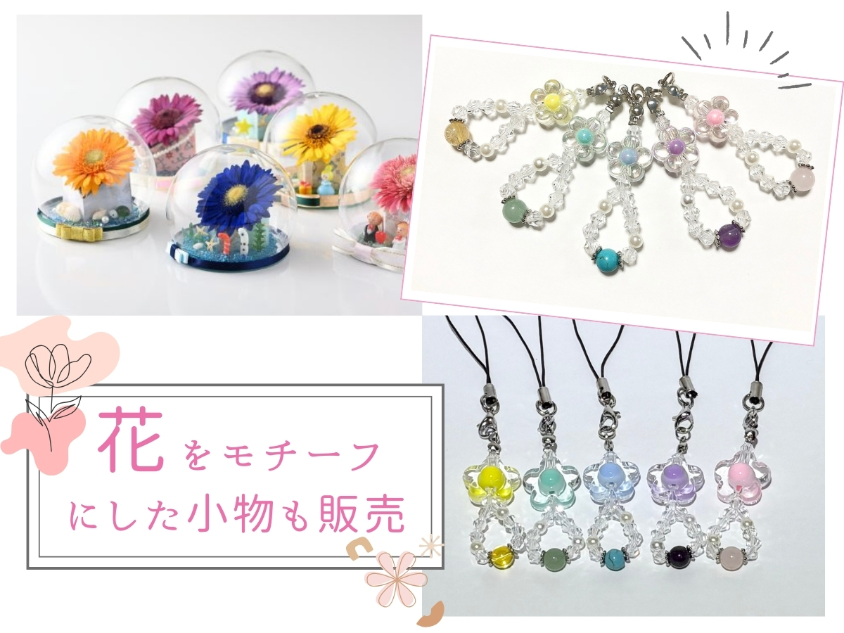 併設ショップでは、浜松産の本物のガーベラをガラスドームに閉じ込めた「ガーベラドーム」や、花モチーフのストラップも販売されており、思わず目移りしてしまいそうです。