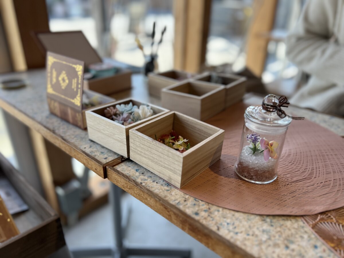 ガラスボトルに花をあしらいながら仕上げていく時間は、旅の思い出を形に残せるゆったりとした時間にぴったり。完成した作品は、そのままインテリアとして飾れるのも魅力です。