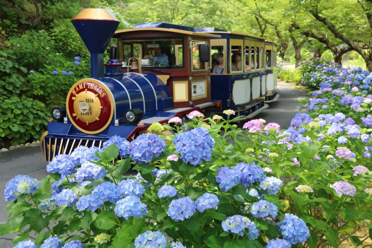 園内を走るフラワートレインに乗れば、花景色を眺めながらゆったり移動できます。歩き疲れたときのひと休みにも◎