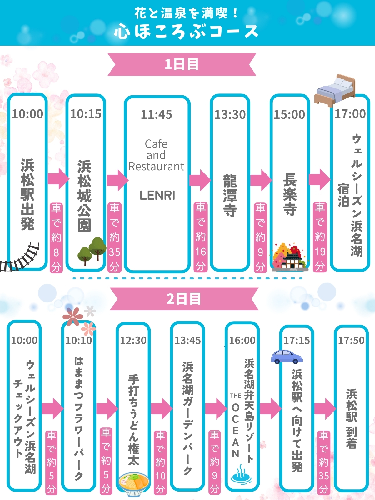 浜松城公園や寺院など、歴史と自然が調和する花スポットを巡りながら、花フェスタのメイン会場である「はままつフラワーパーク」と「浜名湖ガーデンパーク」を訪れる、花フェスタならではのモデルコースです。