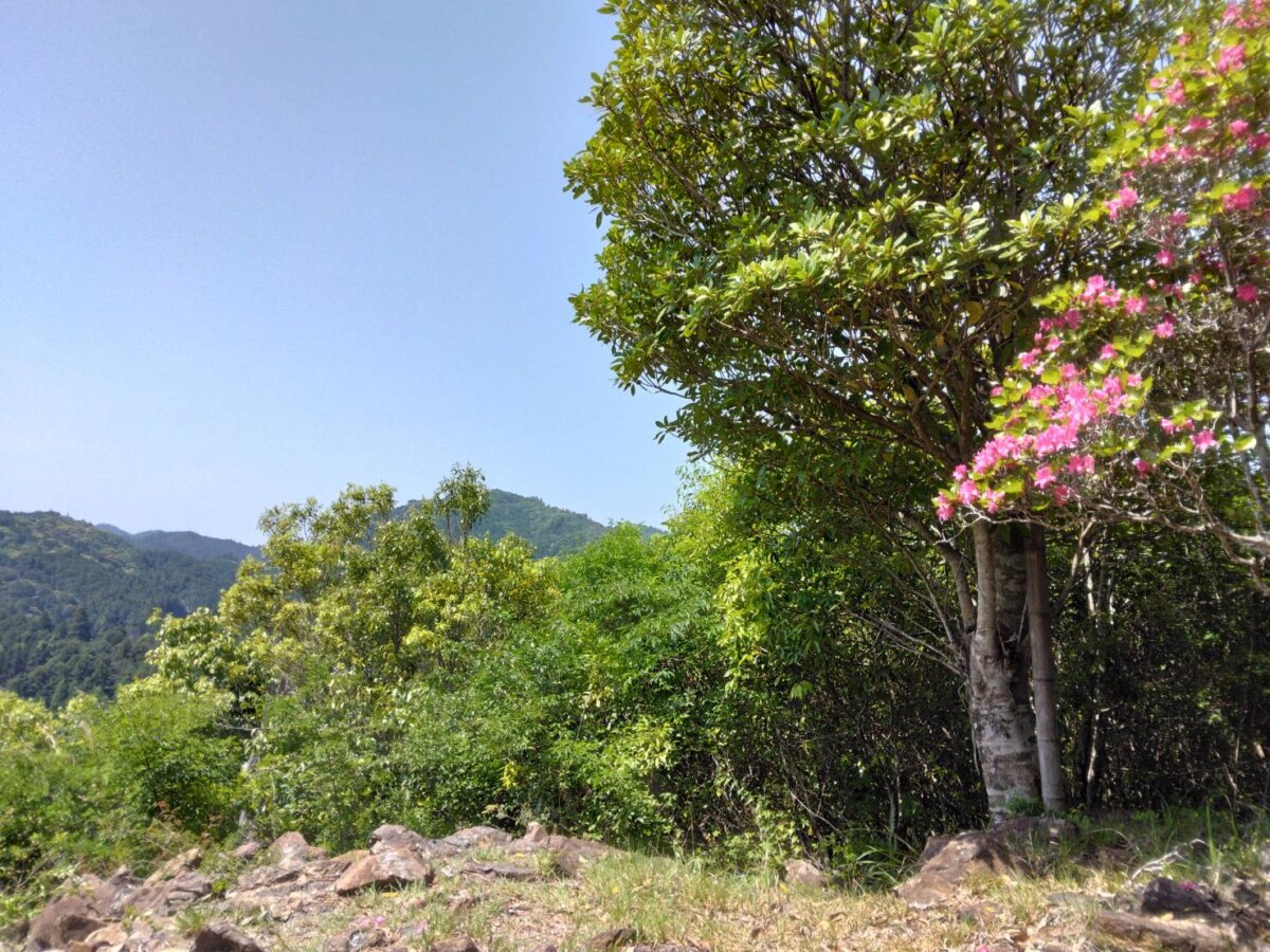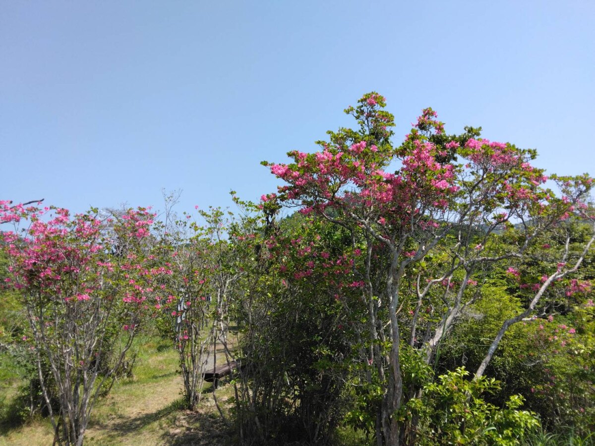 小高い山の上にある園内には、約4,000株の渋川ツツジが自生しています。一般的なツツジとは異なり、木は約5mほどと背が高く、華やかな紅紫色の花が特徴です。