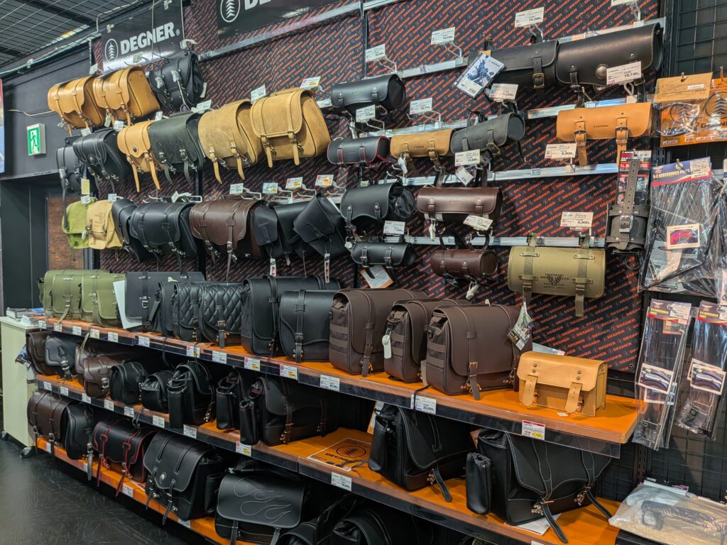 バイクウェアや、ブーツなどのライディングアイテムも充実しており、バックなどのセカンドアイテムも充実!