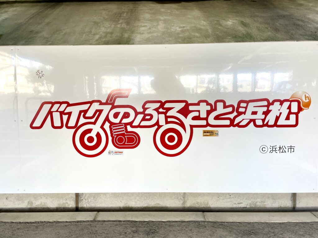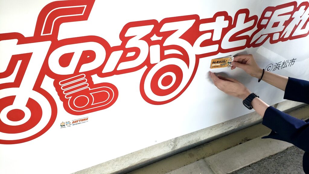 バイクのふるさと浜松の看板に私たちもシールを貼ってきちゃいました。