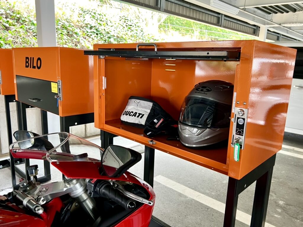 パワーアップした二輪専用駐輪場はもちろん屋根付きで、鍵付きのヘルメットロッカー付き!