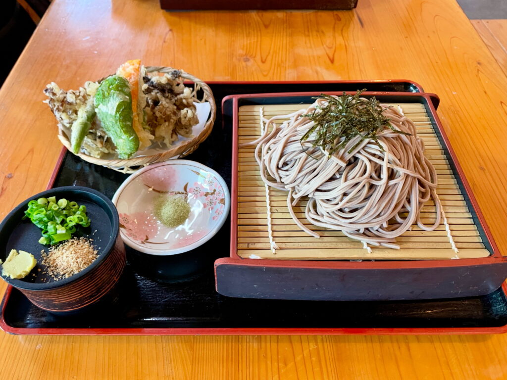 「レストラン熊かあさんの店」では、打ち立てのお蕎麦を、地元くんまでとれたマイタケの天ぷらとともにいただけます。
