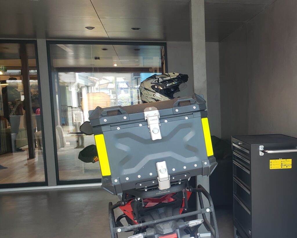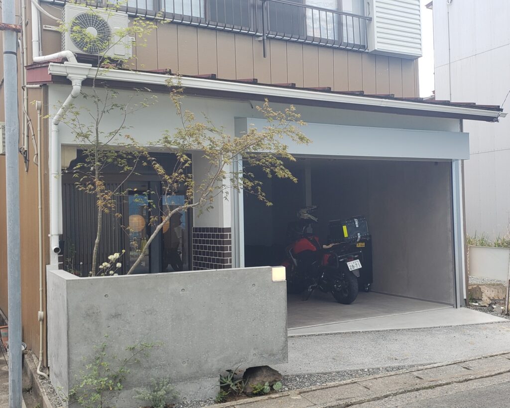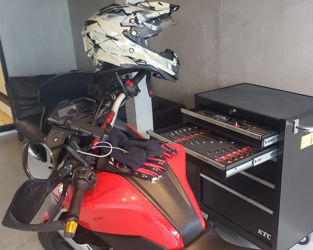 屋内ガレージには、最新の工具やヘルメット置き場も整備。愛車をしっかりと保管できるので、安心して宿泊できます。