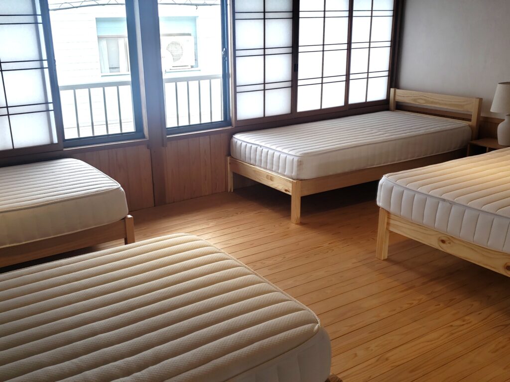 2階は洋室と和室の寝室などを備え、「バイクでここへ来て、バイクと一緒に宿泊を楽しみつつ、地域との交流が生まれる場所になれば」との思いが込められています。