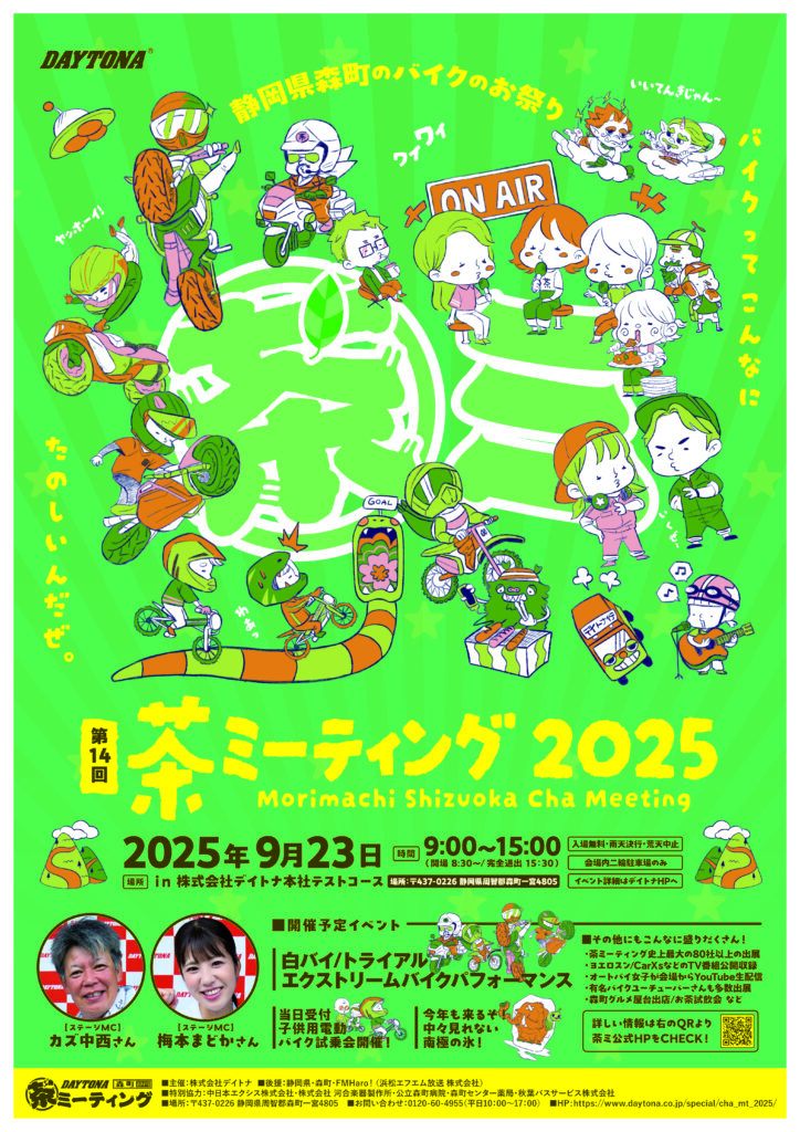 2025年9月23日(火・祝)、静岡県周智郡森町にある株式会社デイトナ本社テストコースにて、バイクファン必見のイベント「茶ミーティング2025」が開催されます。入場は無料。時間は9:00~15:00(開場8:30、完全退出15:30)で、雨天決行・荒天中止となります。