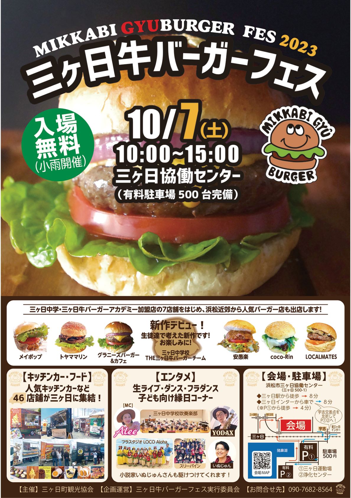 「三ヶ日牛バーガーフェス」が、 三ヶ日協働センター(浜松市北区三ヶ日500-1)にて開催されます。 当日は、三ヶ日中学校・三ヶ日牛バーガーアカデミー加盟店の7店舗をはじめ、 はままつ近郊から人気バーガー店など46店舗が三ヶ日に集結!