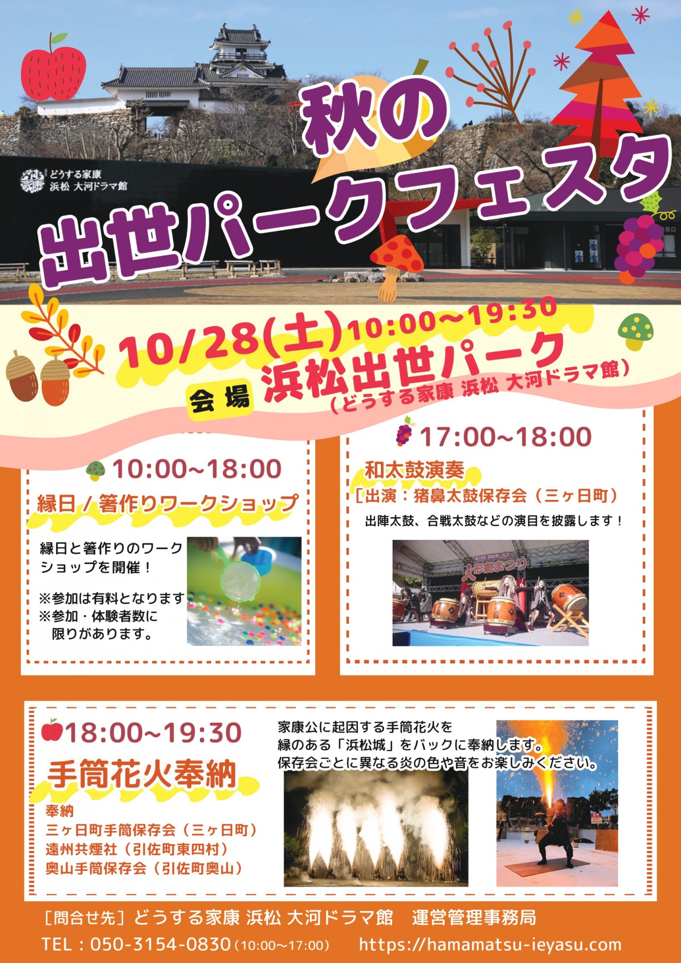 ワークショップや和太鼓演奏から、浜松城をバックに迫力の手筒花火も披露されます。