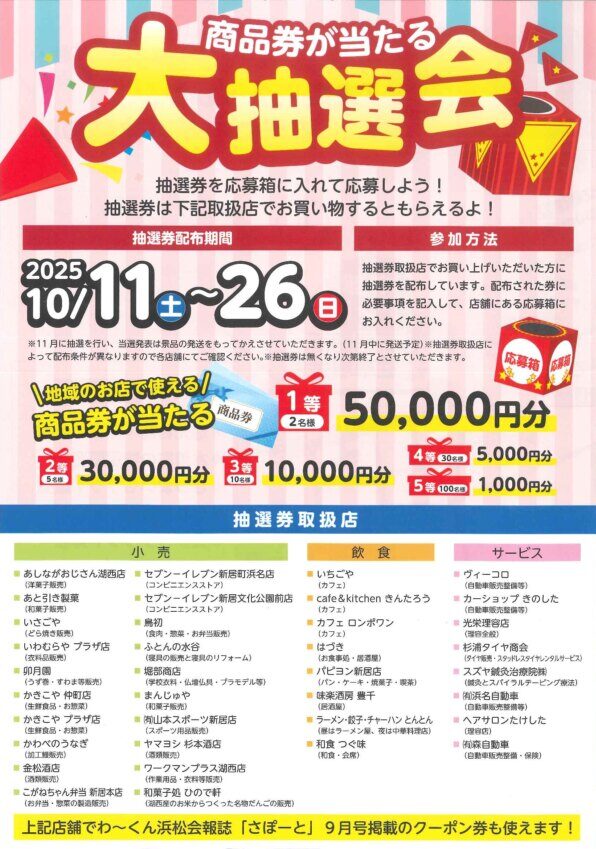 10月26日(日)までの期間中、対象店舗でお買い物をした方に抽選券を配布しています。抽選で地域のお店で使える商品券が当たります。