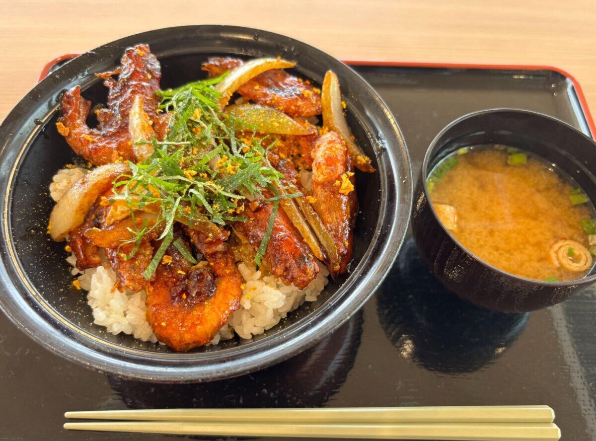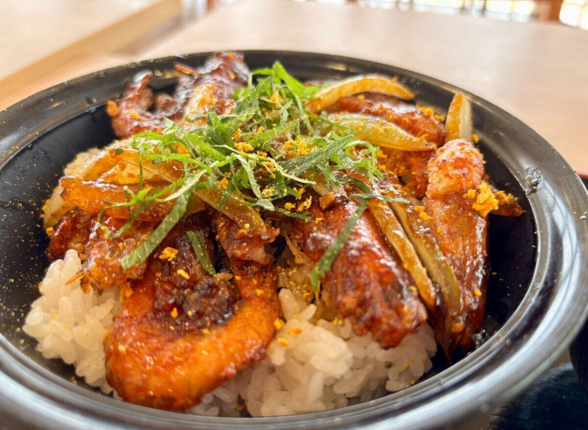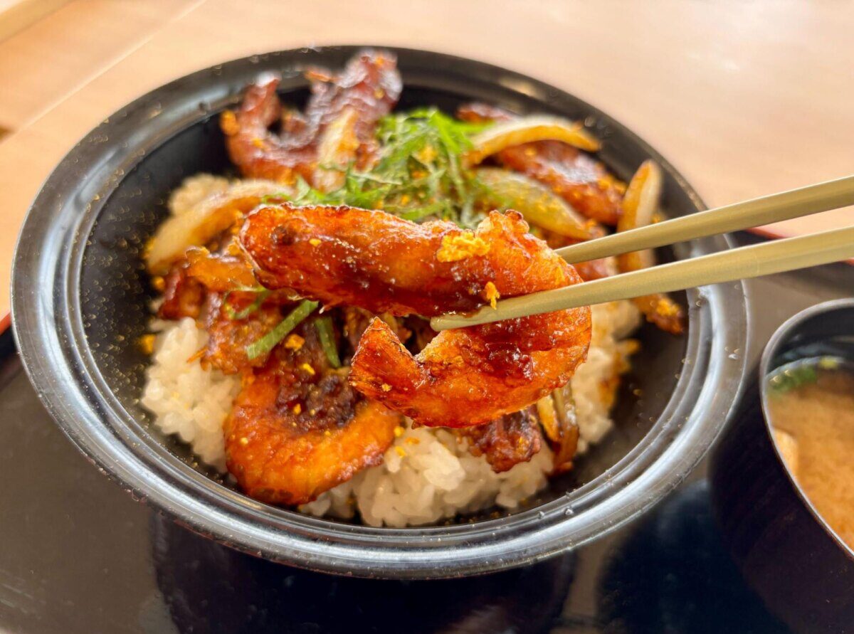 磐田市産の幸えびは殻がやわらかく、身はプリッとジューシー。頭から尾まで丸ごとカラッと揚げた幸えびに、甘辛い蒲焼のタレをたっぷり絡め、ご飯の上に贅沢にのせたボリューム満点の一杯です。