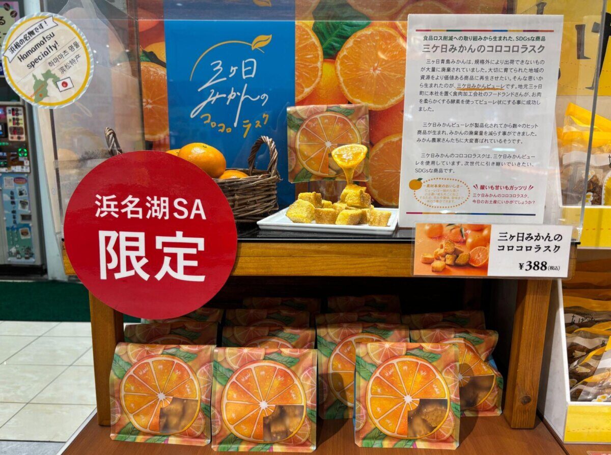 「三ヶ日みかんのコロコロラスク」は、EXPASA浜名湖でしか購入できない限定スイーツ。地元の特産品・三ヶ日みかんのピューレを使用したひと口サイズのラスクです。