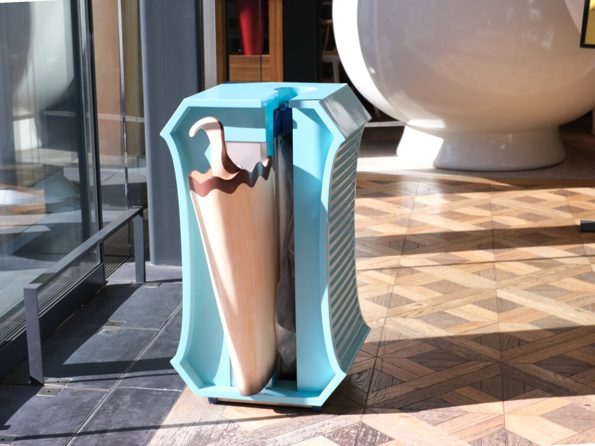 大きな鉛筆削りのオブジェ……かと思いきや、実はこちらは傘袋スタンド。