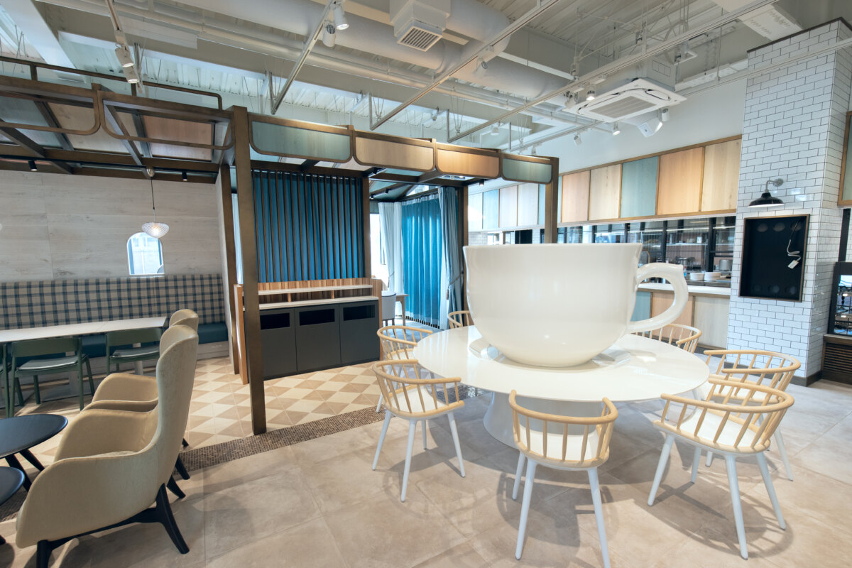 その奥、カフェ&ベーカリー「とらとふうせん」には、白いコーヒーポットとカップ。