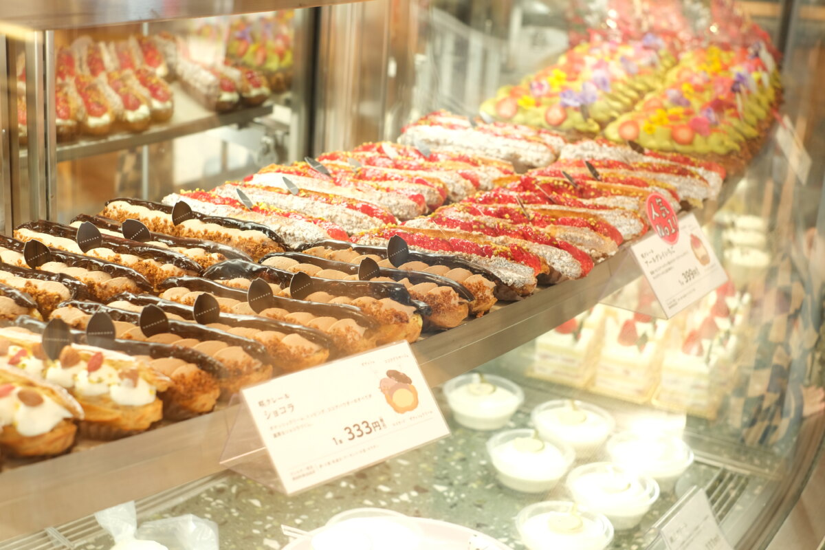 エクレアを春華堂流にアレンジしたスイーツで、年間約11万本も販売される大人気商品です。咲クレールは、スイーツバンクのエントランスでイートインも可能です。