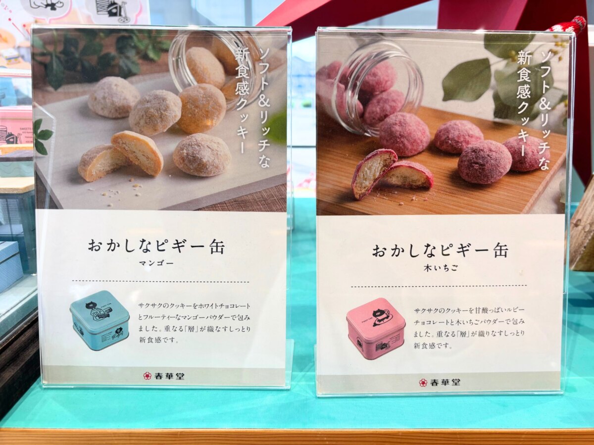 SHOP春華堂では、ピギーをモデルにした上生菓子や、限定クッキー「おかしなピギー缶」も売っています。サクサクでほろりとしたリッチな口どけがたまらない一品です。