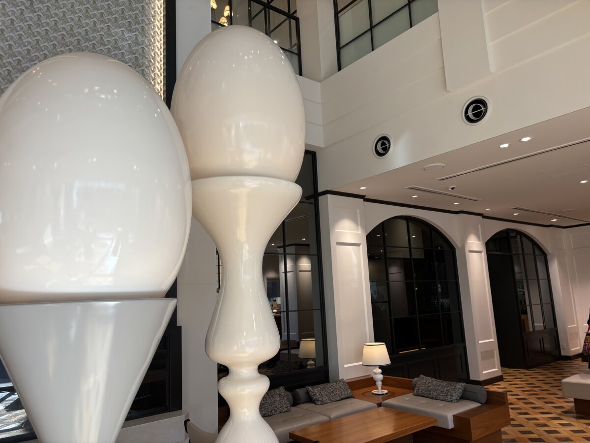 施設に一歩踏み入れると、モダンな空間の中に巨大なエッグスタンドがお目見え。