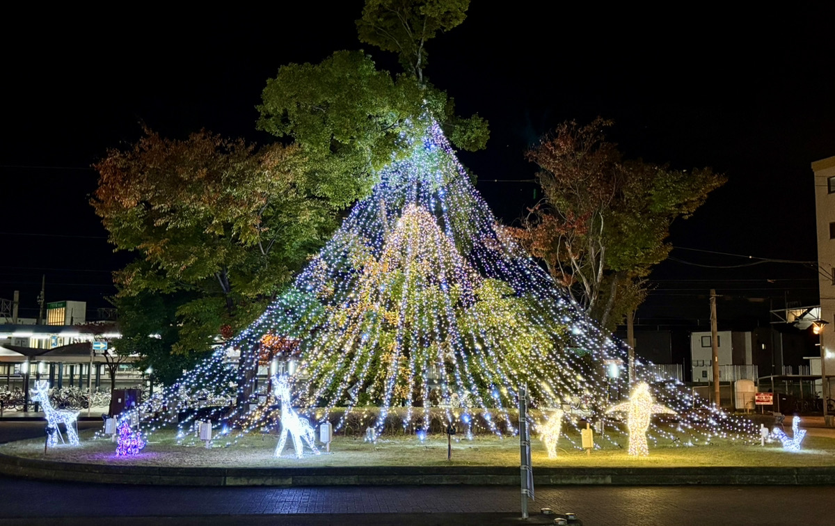 駅前ロータリーと目の前の広場にある街路樹や街路灯などが、キラキラと輝く電飾で彩られています。