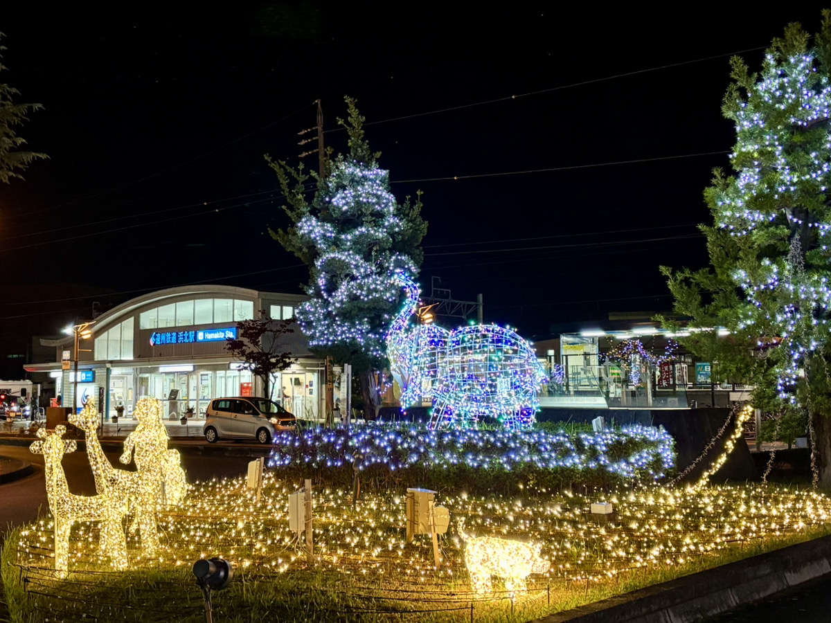 遠州鉄道「浜北駅」前にある複合施設「なゆた・浜北」のイルミネーションが、幻想的な夜の風景をやさしく照らします。
