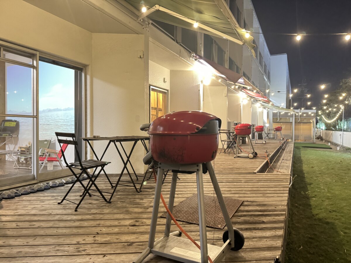 テラスで本格バーベキューが楽しめる設備も併設されています。