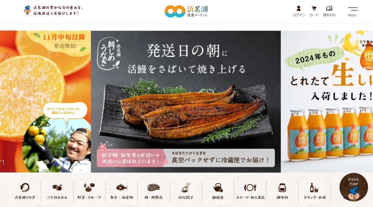 活鰻を朝じめしたうなぎをはじめ、幻の白たまねぎや樹齢20年以上の古樹で育てられた柿、完熟の三ヶ日みかんなど、旬の食材や美味しい食材を厳選して販売している通販サイトです。