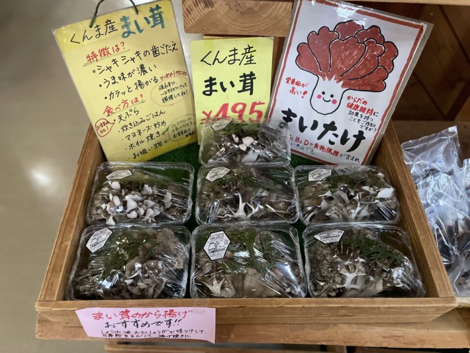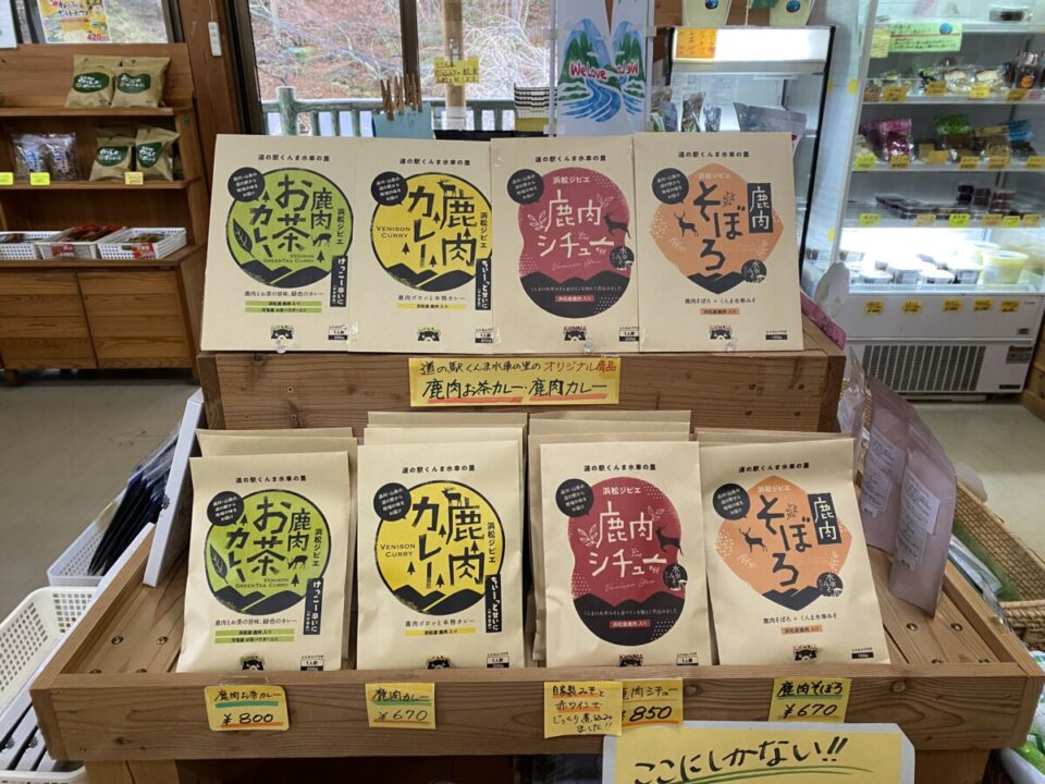 「道の駅 くんま水車の里」オリジナル商品鹿肉カレーのレトルトやくんま産の舞茸も購入できます。