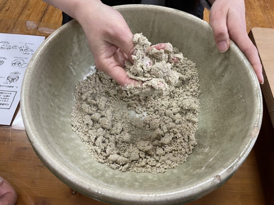 まずは、そば粉に水を入れて両手でグルグルと混ぜていきます。ポロポロだったそば粉が徐々にひとつにまとまりはじめたら、耳たぶぐらいの柔らかさになるまでねっていきます。
