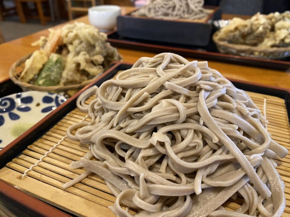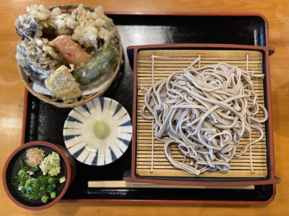 天ぷらの盛り合わせは、くんま産の肉厚な舞茸を中心に野菜の天ぷらが揚げたてサクサク!そばと一緒にあっという間に完食しました。