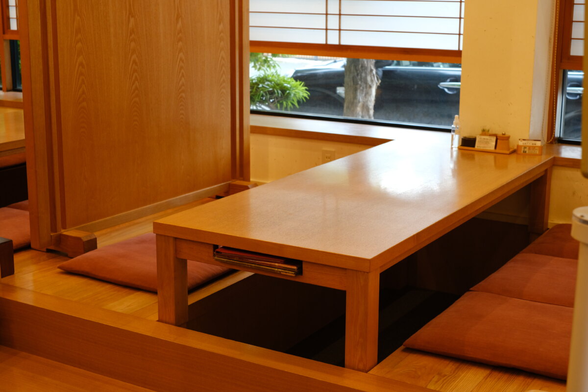 テーブル席以外にも、小さなお子さま連れのご家族でもくつろぎやすい掘りごたつ席や、子供用の椅子もあり、ご家族でゆったりお食事を楽しめる環境が整っています。