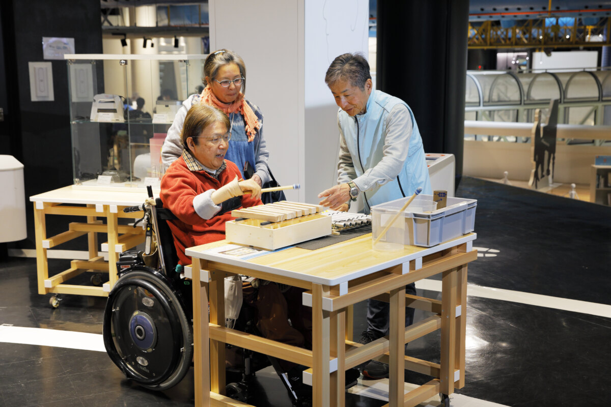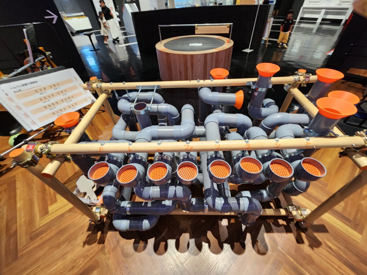 「てんてこ楽器」のコーナーでは、フライパンなどの日用品や配管などを利用したオリジナルの楽器を実際に演奏できます。