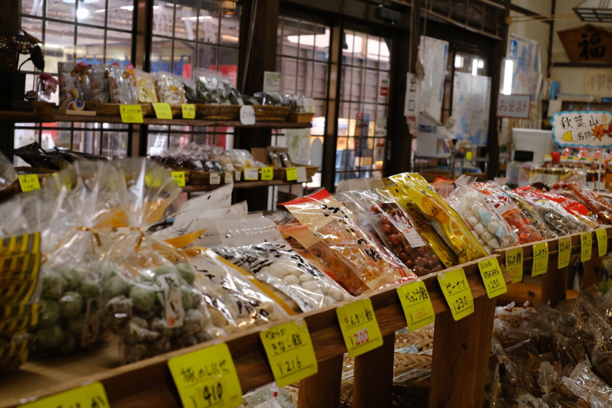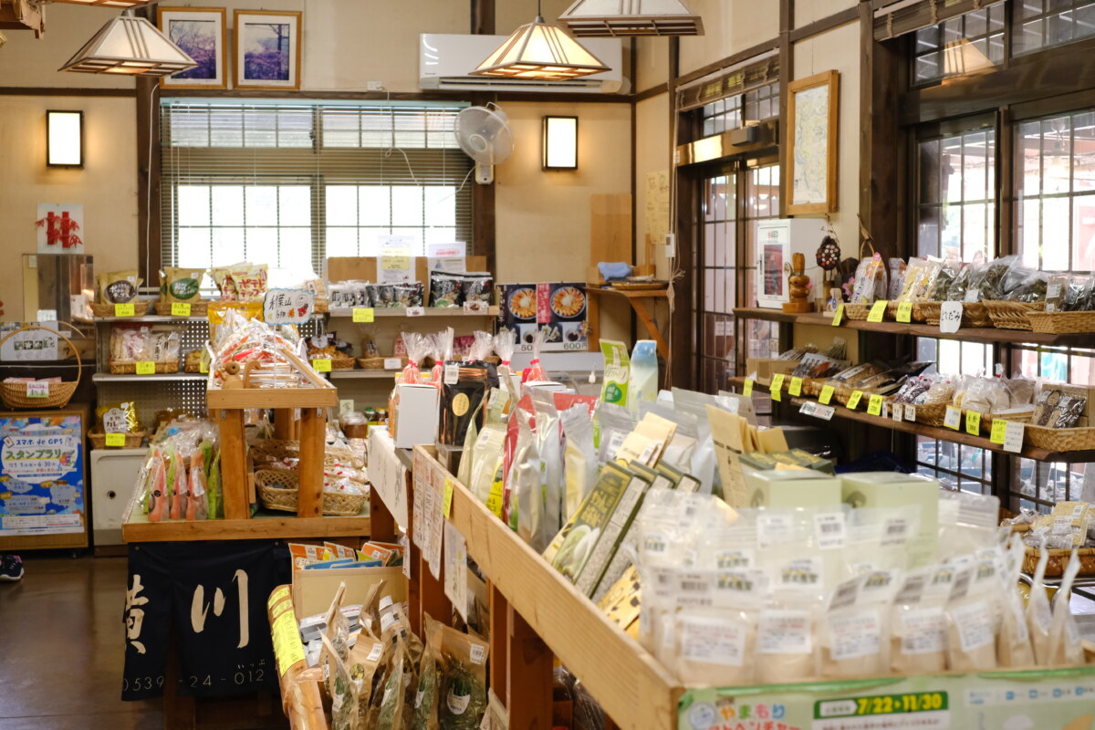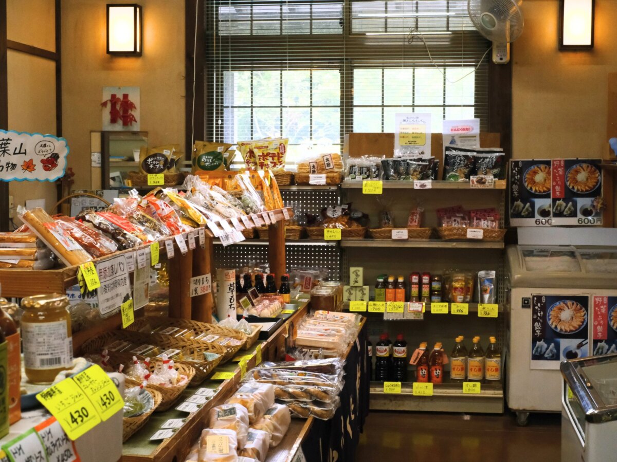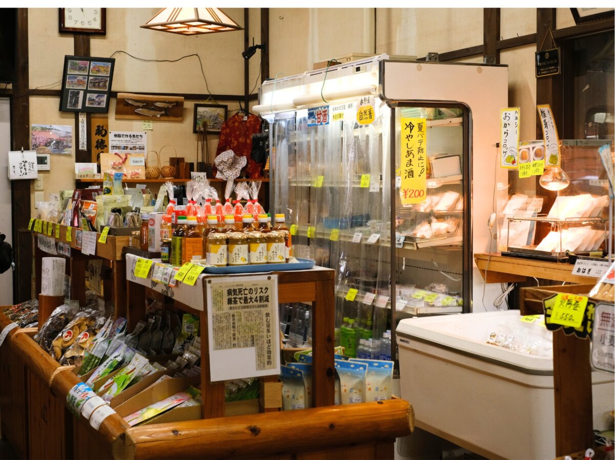 地元の特産品が並ぶ店舗に入ってみましょう。囲炉裏もあって、昔懐かしい温かみのある空間です。