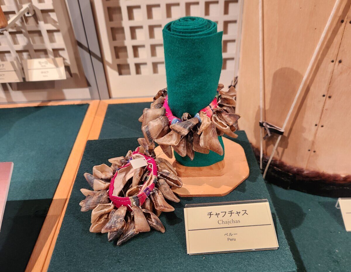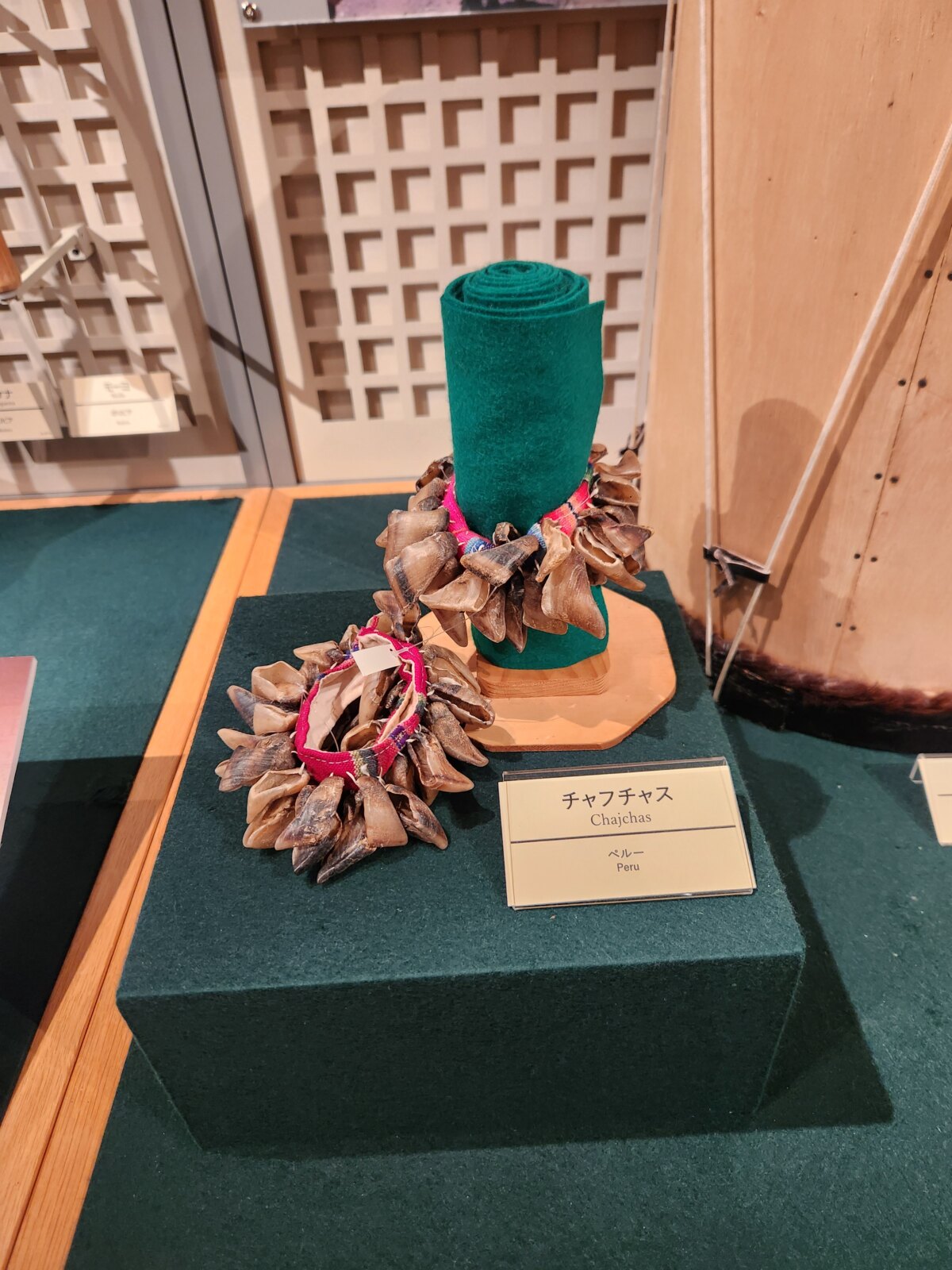音を出すために作られた道具であれば「楽器」としての展示対象になるため、動物の爪で作られた楽器やその土地で食されている動物の抜け殻を使った珍しい楽器なども展示。