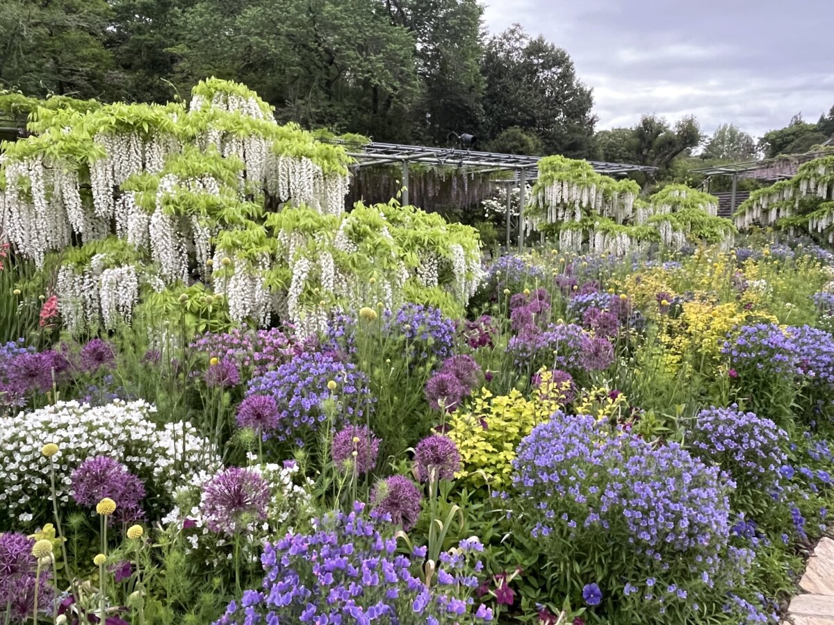 ナガフジの隣にある「スマイルガーデン」は、庭木仕立てにしたシロフジも庭園全体を引き立て、まるでおとぎの世界に迷い込んだかのよう。