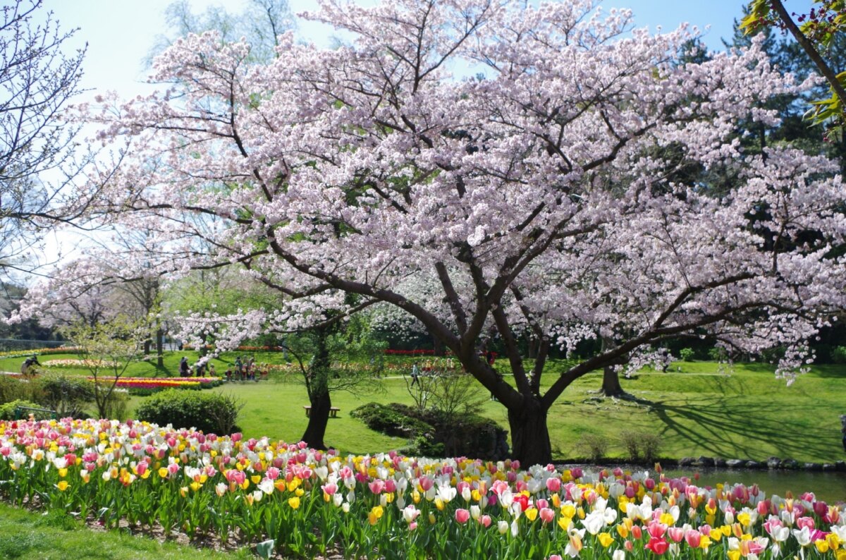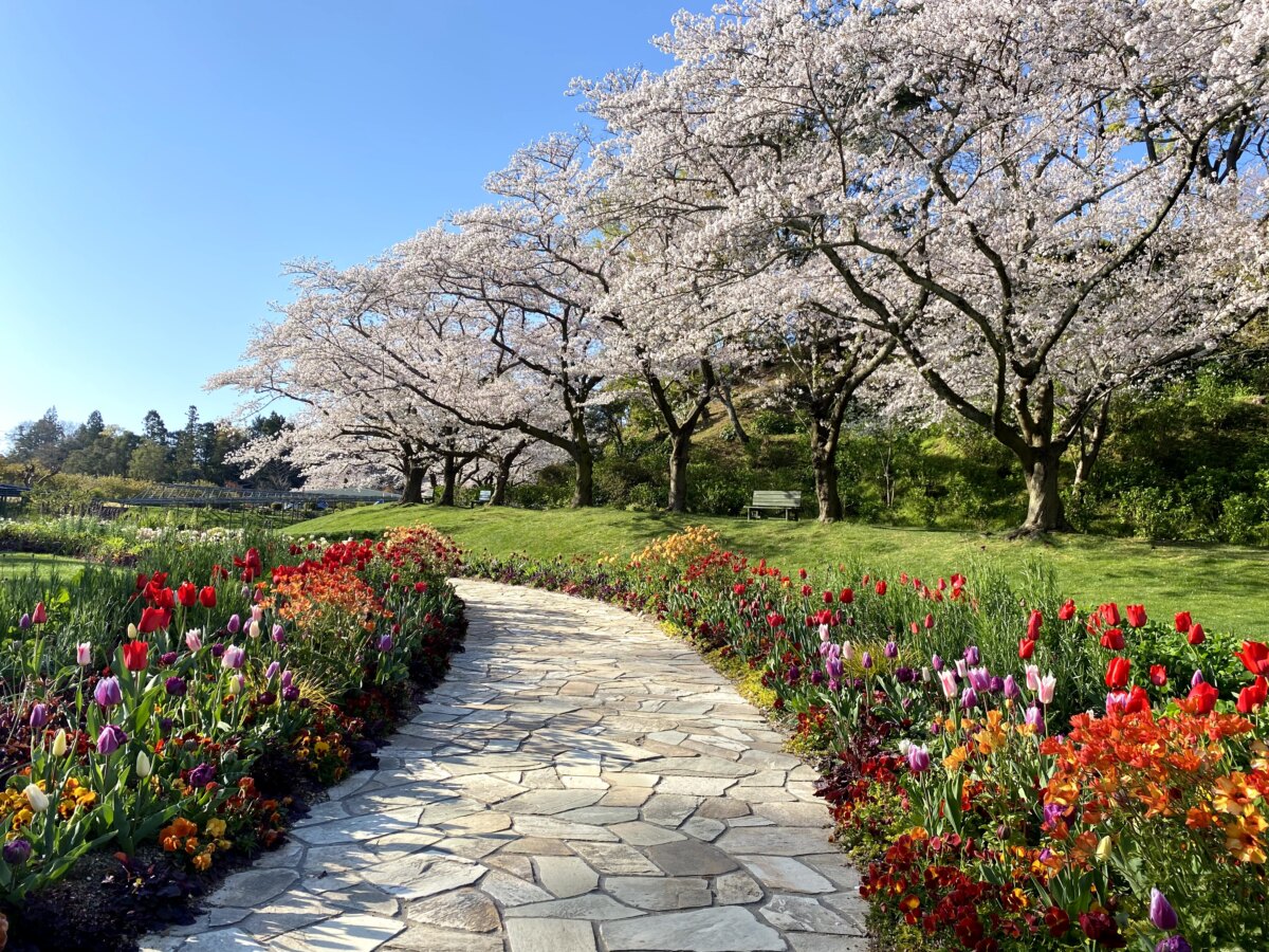 見ごろは1週間ほどと短いのですが、頭上に咲く淡いピンク色のサクラと足元に広がる青々とした芝生。そして色とりどりのチューリップが競演した風景は必ず一度は見ていただきたい景色です。