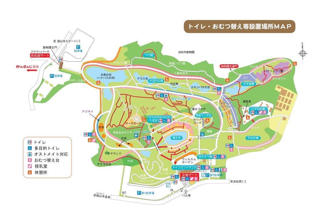 バス:浜松駅北口のバスターミナル1番乗り場より「かんざんじ温泉行き」に乗車、「フラワーパーク」バス停下車すぐ。 所要時間約40分