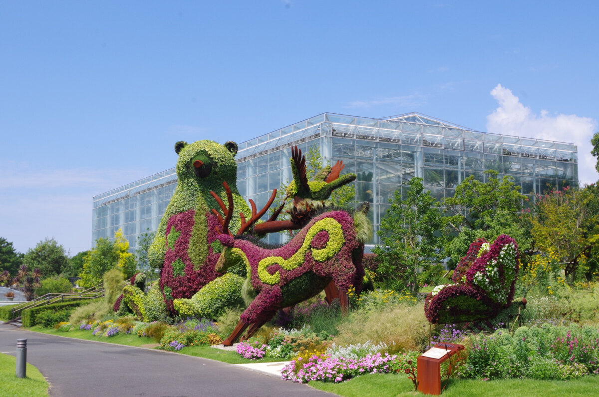 高さ7mのクマをはじめ、シカやタヌキなど7体の動物たちが花や緑で立体的につくられているモザイカルチャー「森の仲間たち」。