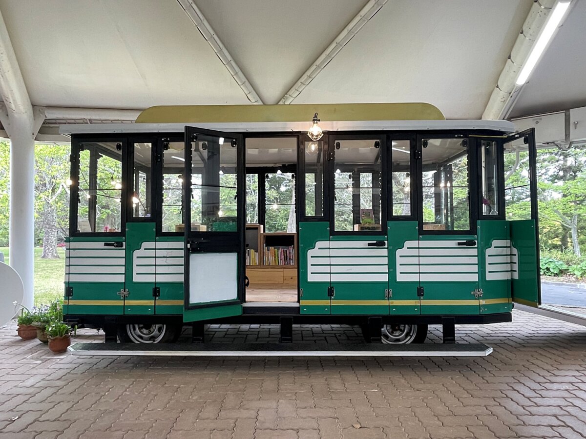 現役を引退したフラワートレインの客車を利用し、内部を「図書館」風にリフォームした図書トレイン。