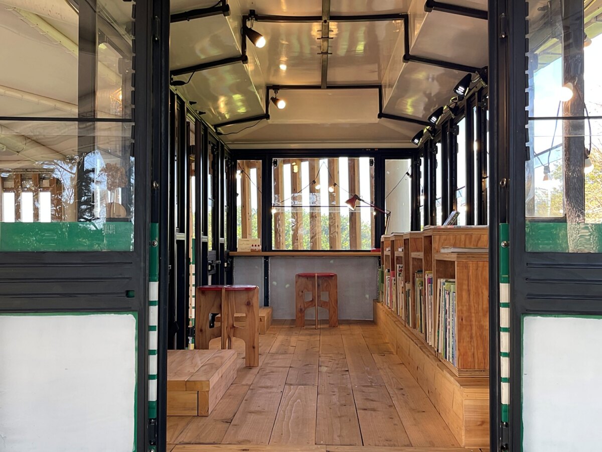 バス内には絵本や植物関係の本などが並べられており、お子さまなら客車のなかで、大人の方なら見晴らしの丘のベンチで読書ができます。