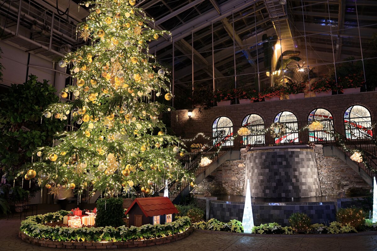 温室内では高さ8mのモミの木とともに、華やかなポインセチアなどで彩られ「ホっと」心が温まるクリスマスシーンへといざないます。