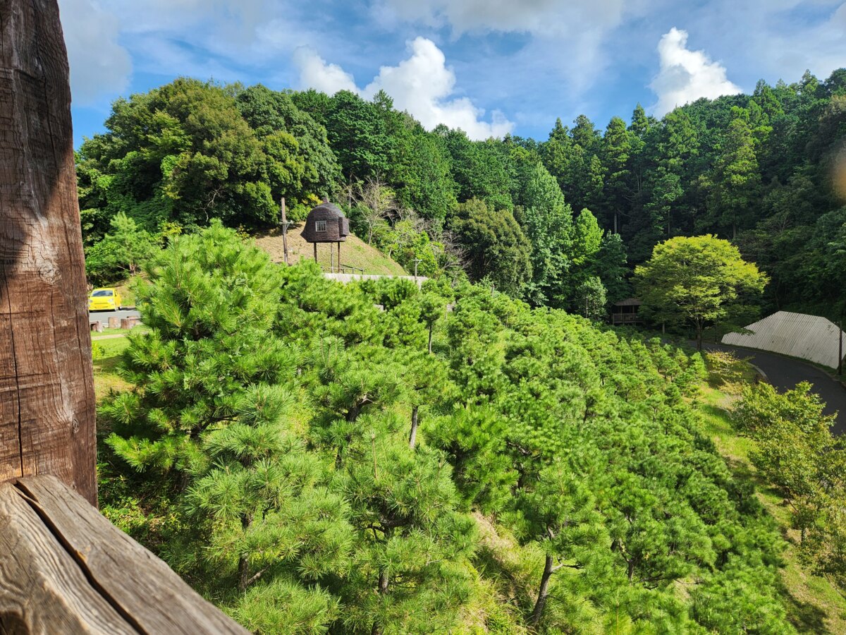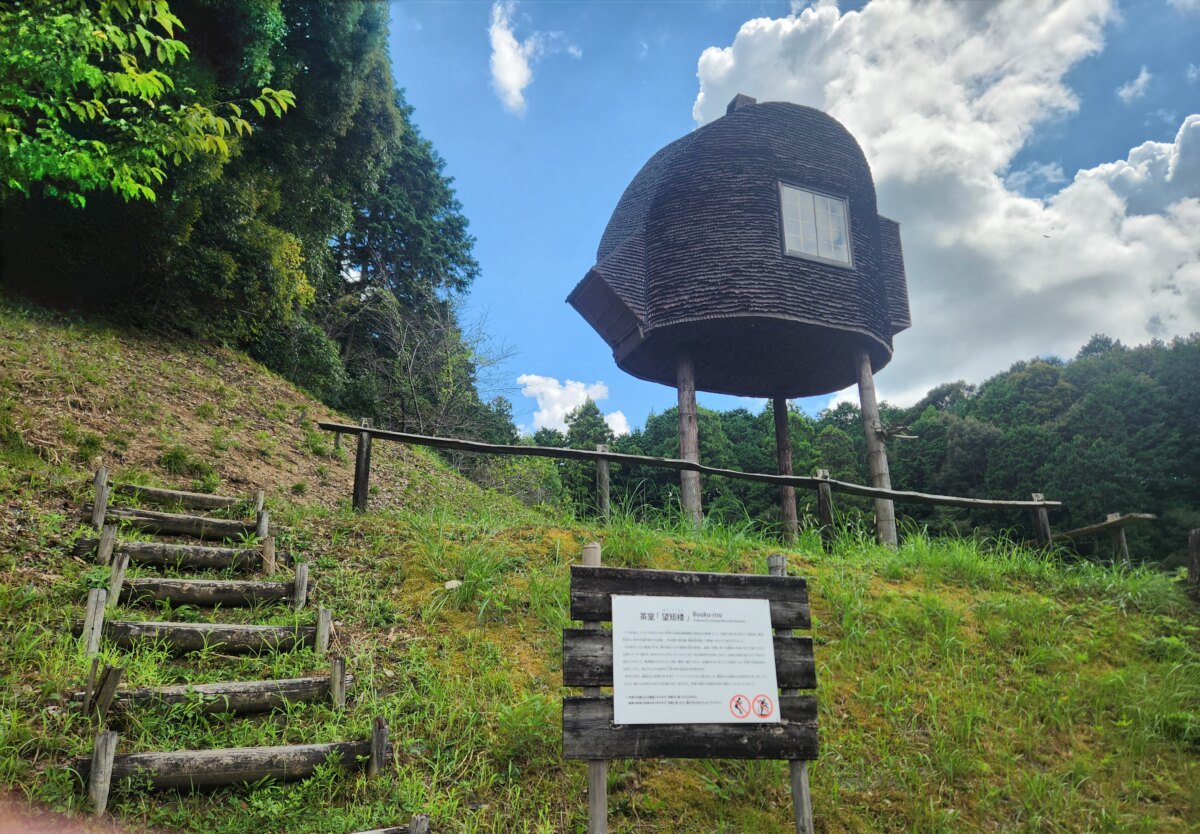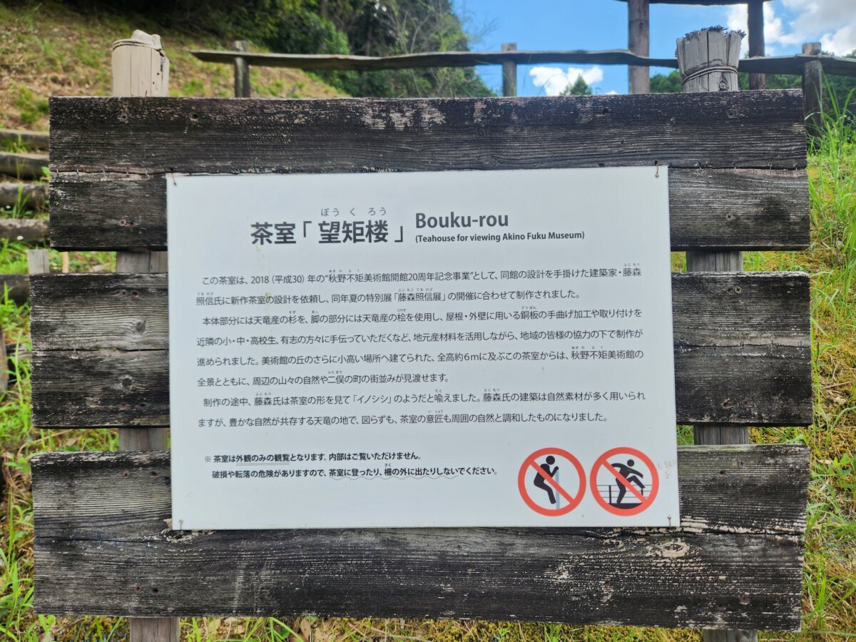 敷地内に完成した茶室「望矩楼」は、地元の天竜材を使用。個性的な外観は、美術館との相乗効果で独特の世界観を演出しています。