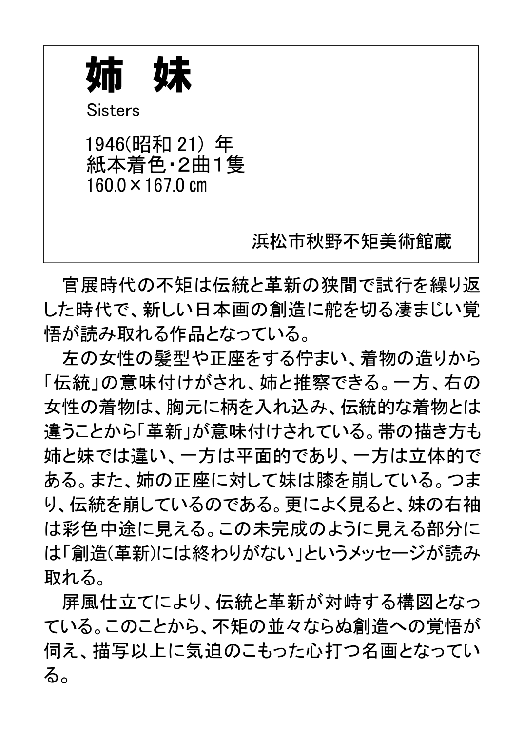 代表作「秋野不矩 ≪姉妹≫ 1946年」に添えられる鈴木館長の解説パネルをご紹介します。